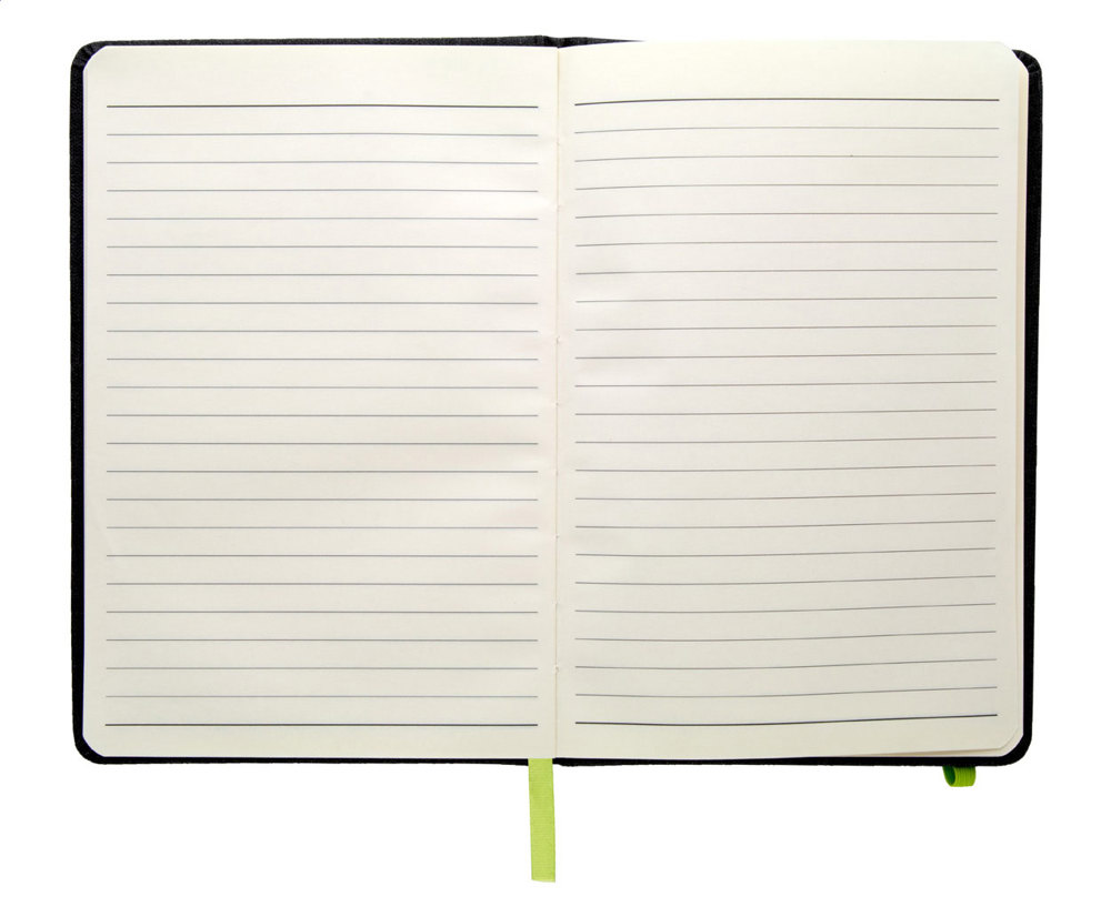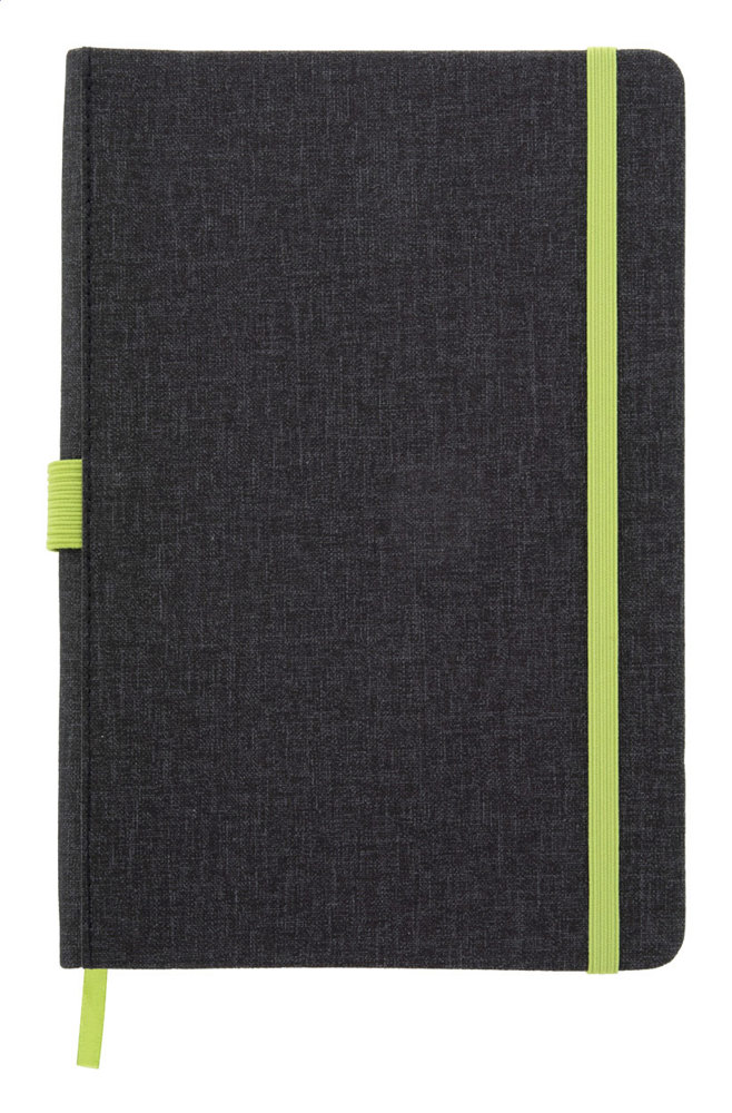 Notizbuch mit strukturiertem Kunstledereinband, farblich aufeinander abgestimmten Lesezeichen, Gummiband und Stiftehalter. 96 Blätter (liniert), Größe A5.