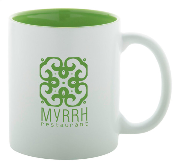 Weiße Keramiktasse mit farbiger Innenseite und Zwischenbeschichtung für eine farbige Gravur (Gravurfarbe wie Innenfarbe). Füllmenge: 350 ml. Einzeln in Geschenkbox.