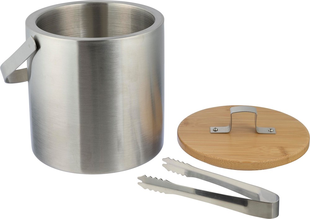 Doppelwandiger Eiskübel aus Edelstahl mit Deckel aus Bambus und Tragegriff aus Edelstahl. Innen aus Edelstahl 304, außen aus Edelstahl 201. Mit Eiszange und einem Fassungsvermögen von 1200 ml. Einzeln verpackt in braunem Karton.