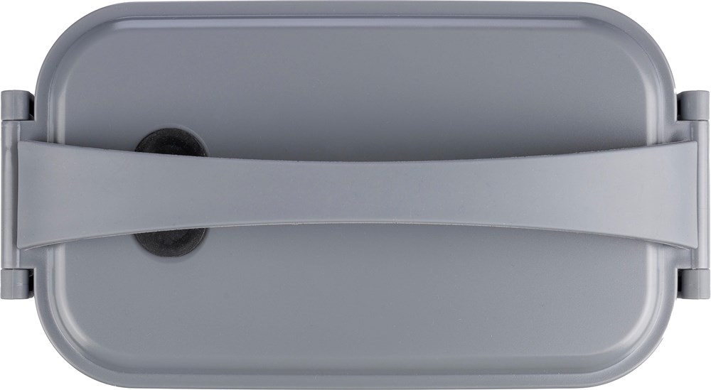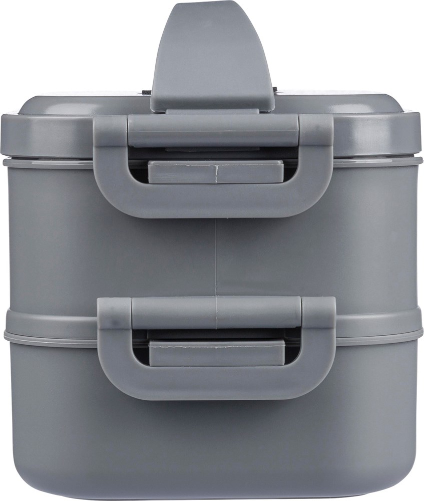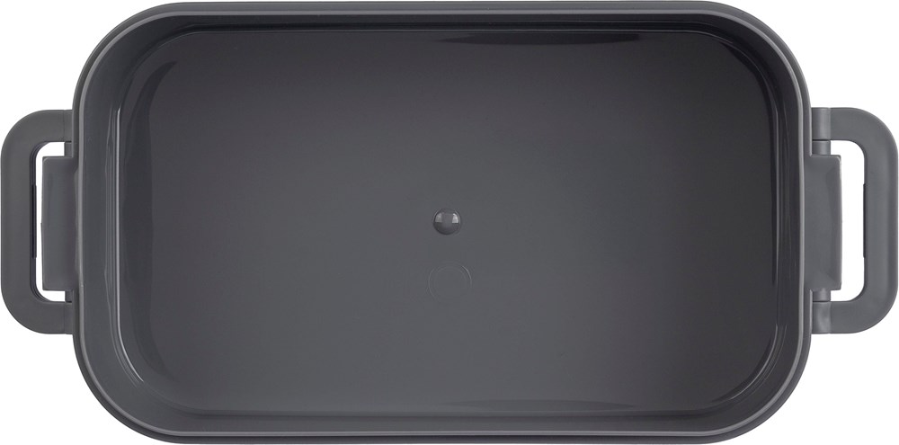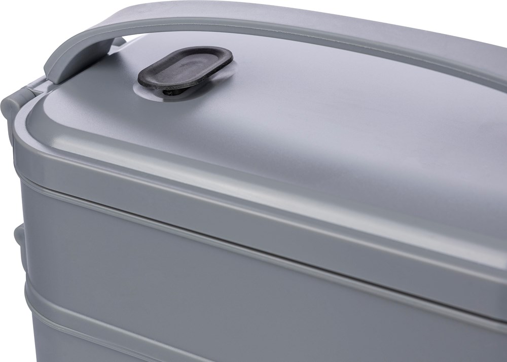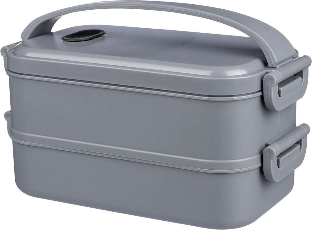 Lunchbox aus PP mit einem Gesamtfassungsvermögen von 1600 ml, aufgeteilt in zwei Schichten zu je 800 ml. Mit mikrowellengeeignetem Silikonventil, Schnappverschluss und Tragegriff aus Silikon. In Großpackungen verpackt.