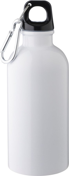 Einwandige Flasche aus recyceltem Edelstahl (s/s304) mit 400 ml Fassungsvermögen, PP-Verschluss und silberfarbenem Aluminiumkarabiner. Auf der Vorderseite ist das Recycling-Logo eingraviert.