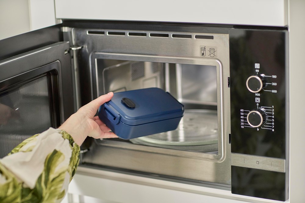 Lunchbox aus PP mit einem Fassungsvermögen von 800 ml. Mit mikrowellengeeignetem Silikonventil und Schnappverschluss. In Großpackungen verpackt.