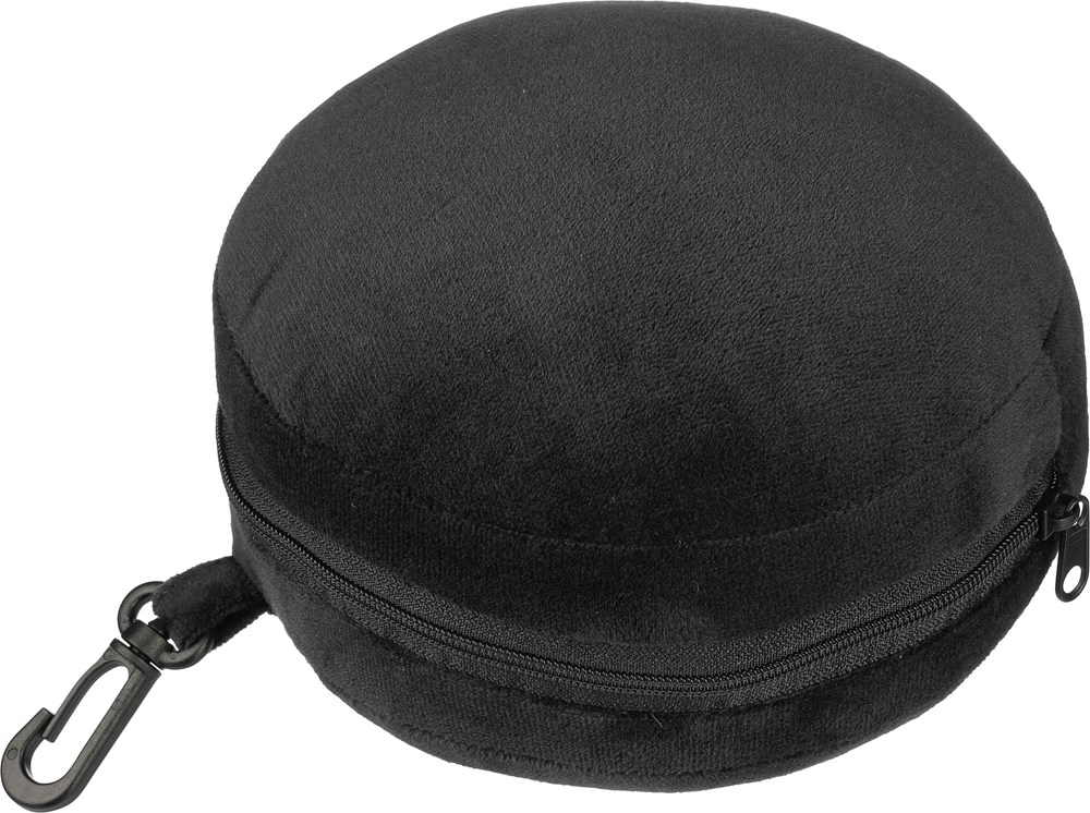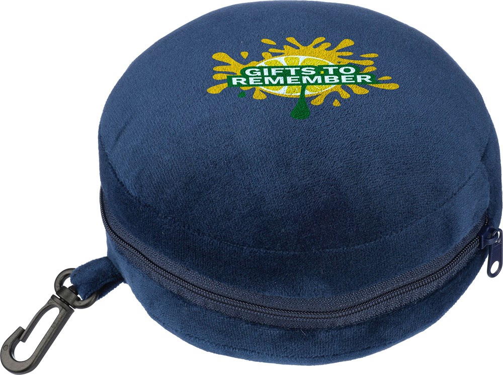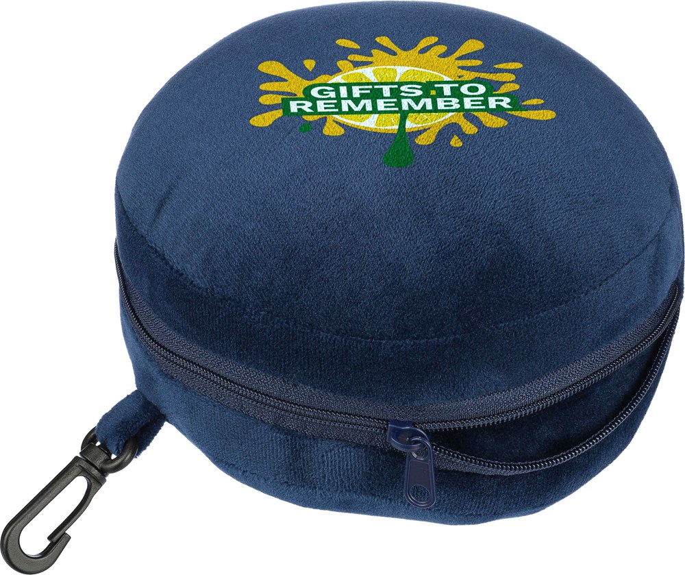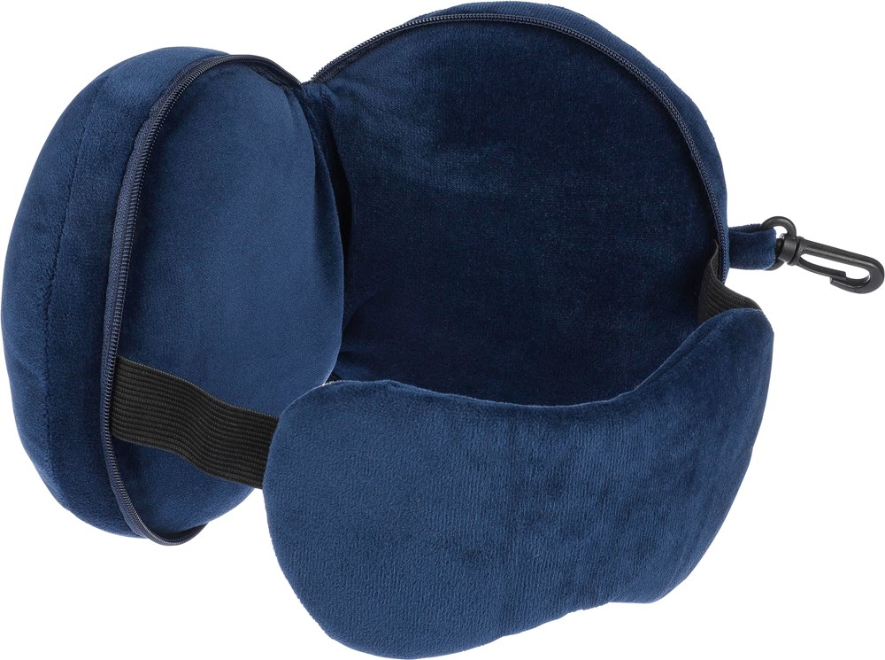 Reisekissen-Set aus Polyester mit weicher Füllung aus Polyester und PP-Baumwolle. Enthält eine Augenmaske und wird durch Öffnen des Reißverschlusses zum Kopfkissen. Mit PP-Karabinerhaken zur einfachen Befestigung auf Reisen.