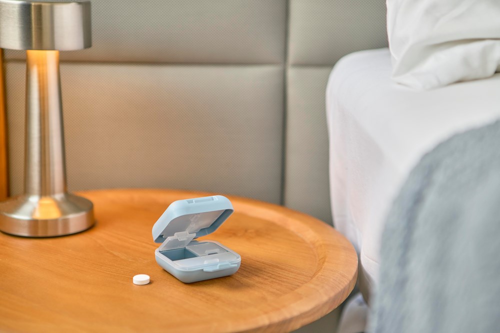 PP- Tablettendose mit 5 einzelnen Fächern, jedes mit eigenem Deckel. Mit Clipverschluss für eine sichere Aufbewahrung.