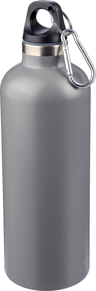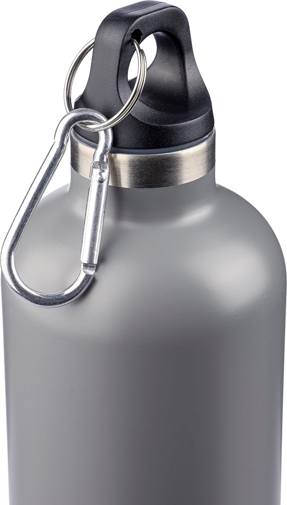 Doppelwandige Flasche aus recyceltem Edelstahl (s/s304) mit einem Fassungsvermögen von 500 ml, PP-Deckel und Aluminium-Karabinerhaken. Hält Getränke 8 Stunden warm und 12 Stunden kalt. Die Flasche hat eine matte Oberfläche (außer Silber) und ist mit einem eingravierten Recycling-Logo versehen. Einzeln verpackt in braunem Karton.