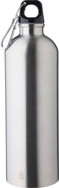 Einwandige Flasche aus recyceltem Edelstahl (s/s304) mit 750 ml Fassungsvermögen, PP-Verschluss und silberfarbenem Aluminiumkarabiner. Auf der Vorderseite ist das Recycling-Logo eingraviert.