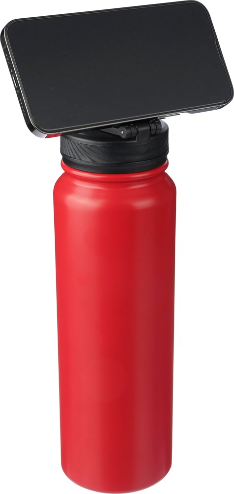 Doppelwandige Edelstahlflasche mit einem Fassungsvermögen von 800 ml. Innen aus Edelstahl 304, außen aus Edelstahl 201, mit Schraubverschluss aus PP. Der Deckel ist mit einem Tragegriff versehen, der gleichzeitig als starker magnetischer Telefonhalter dient. Einzeln verpackt in braunem Karton.