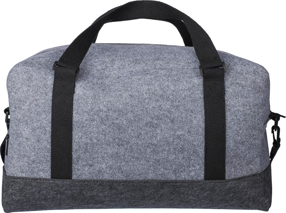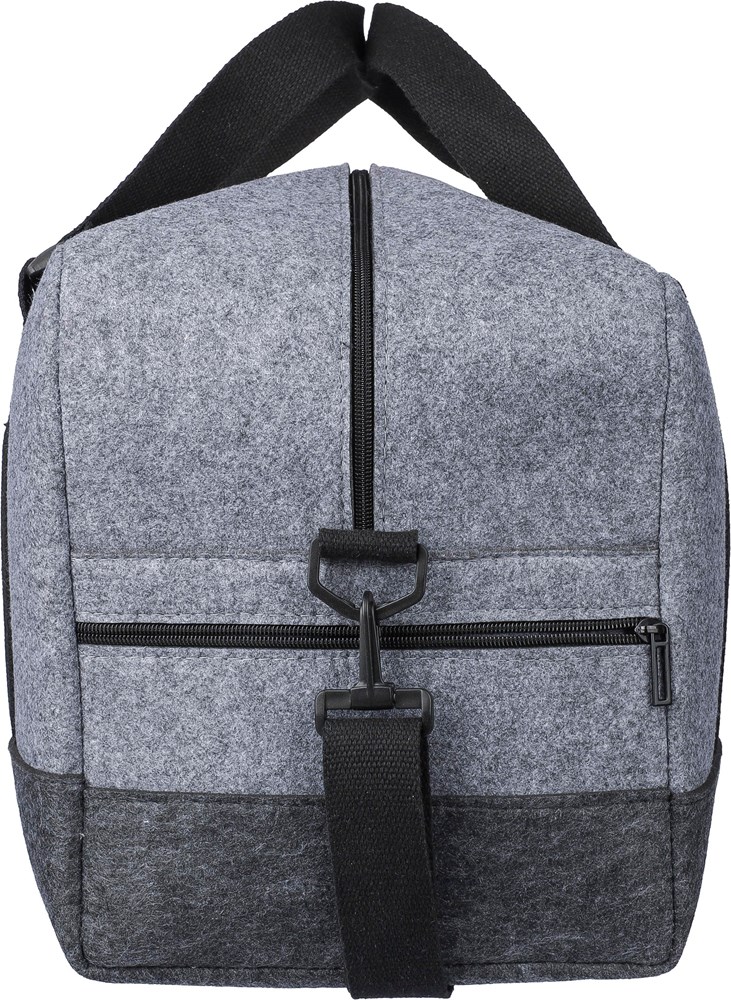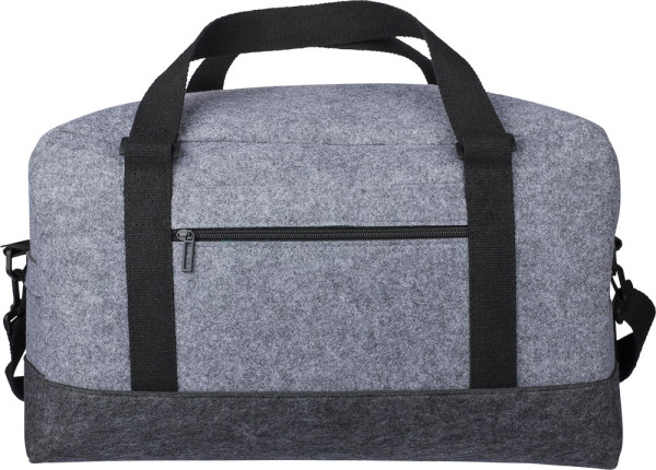 rPET-Sporttasche aus Filz mit Tragegriffen aus Canvas und einem verstellbaren Schultergurt. Mit einem großen Fach mit Reißverschluss und einem kleinen Fach mit Reißverschluss auf der Vorderseite. Enthält ein rPET-Etikett. Fassungsvermögen: 30 L. Tragfähigkeit: 10 kg.