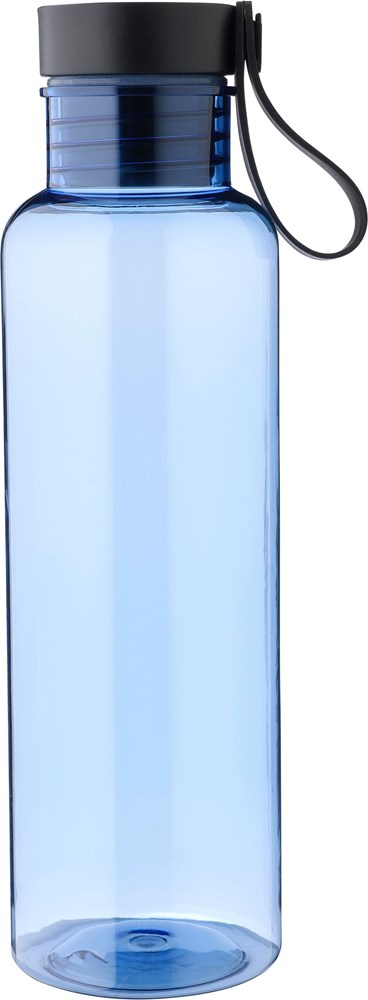 Einwandige rPET-Trinkflasche (750 ml) mit PP-Deckel mit Bambus-Detail auf der Oberseite und Silikon-Trageband. Einzeln verpackt in einem recycelten Polybeutel mit Eierkartonverpackung für den Versand.