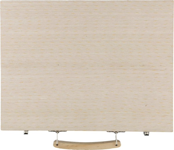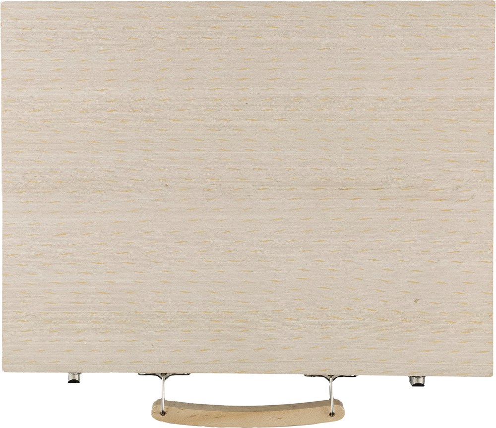 Malkoffer aus Sperrholz mit Holzkasten und Holzgriff, enthält 66 Teile: 12 Wachsmalstifte, 12 Buntstifte (gespitzt), 12 Filzstifte, 12 Ölkreiden, Klebestift, Radiergummi, Anspitzer, Lineal, Pinsel, 12 Farben und eine Palette. Einzeln verpackt in brauner Pappschachtel mit Tragegriff.