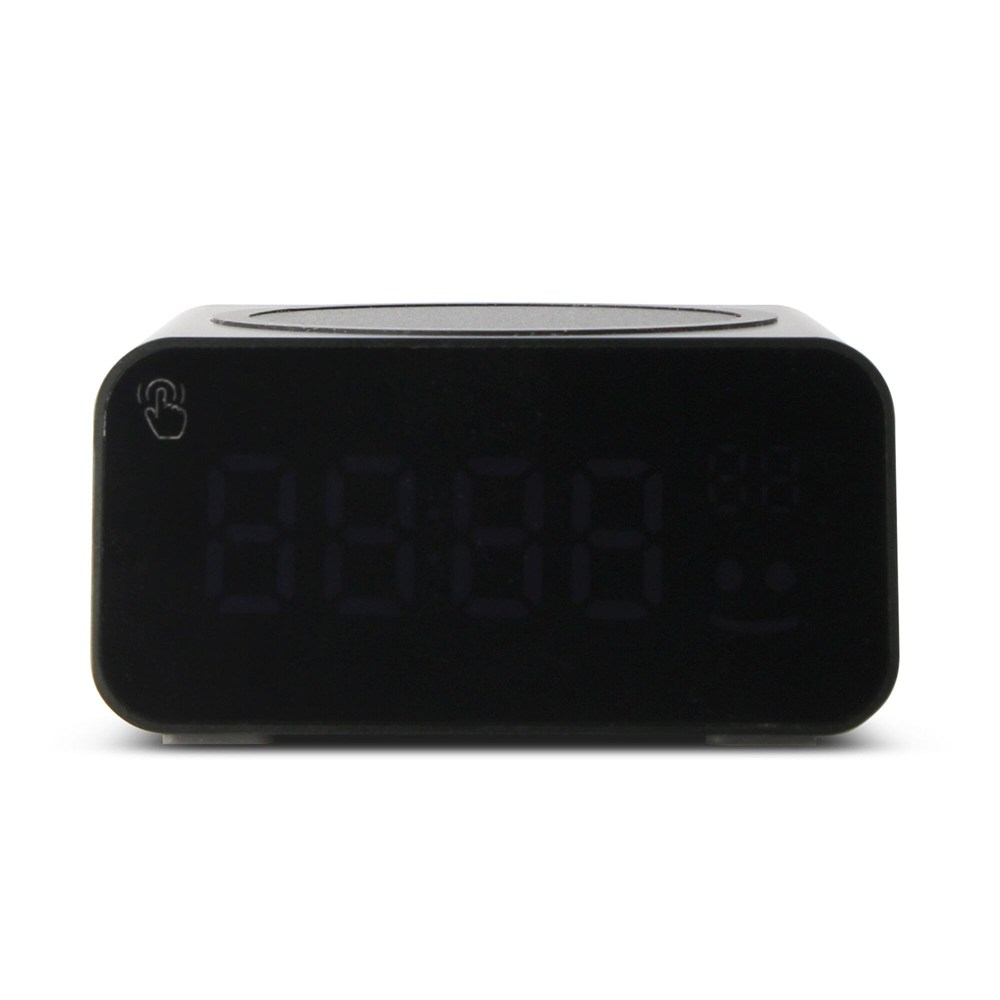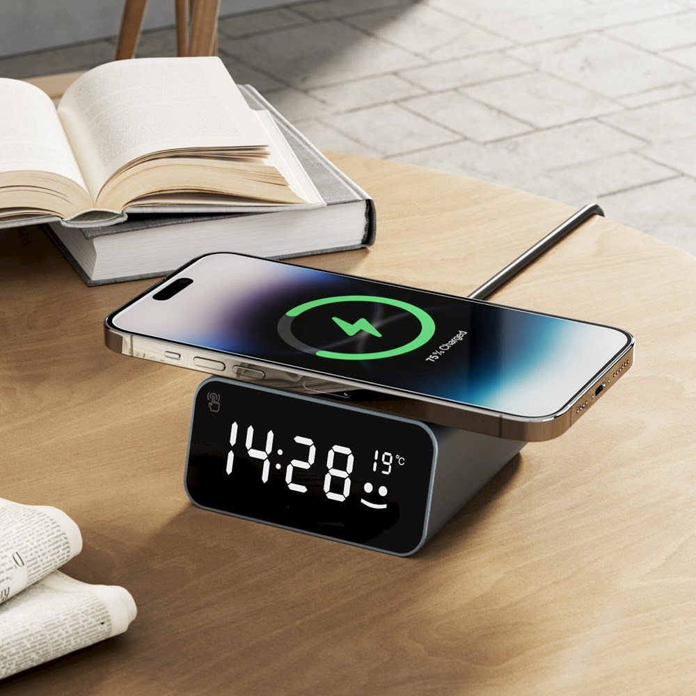 Erleben Sie Innovation! Unsere Uhr mit kabellosem Ladegerät, die aus recyceltem Aluminium gefertigt ist, liefert eine schnelle 15-W-Ladung. Das Smiley-Symbol leuchtet während des Schnellladevorgangs. Mit Temperaturüberwachung, automatischer Zeiteinstellung und einer Weckfunktion ist sie ein Meilenstein in Sachen Komfort und Nachhaltigkeit.