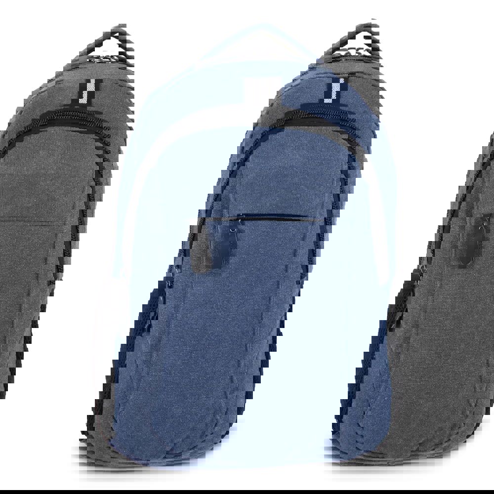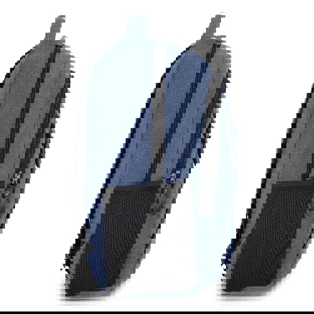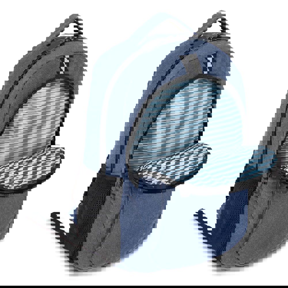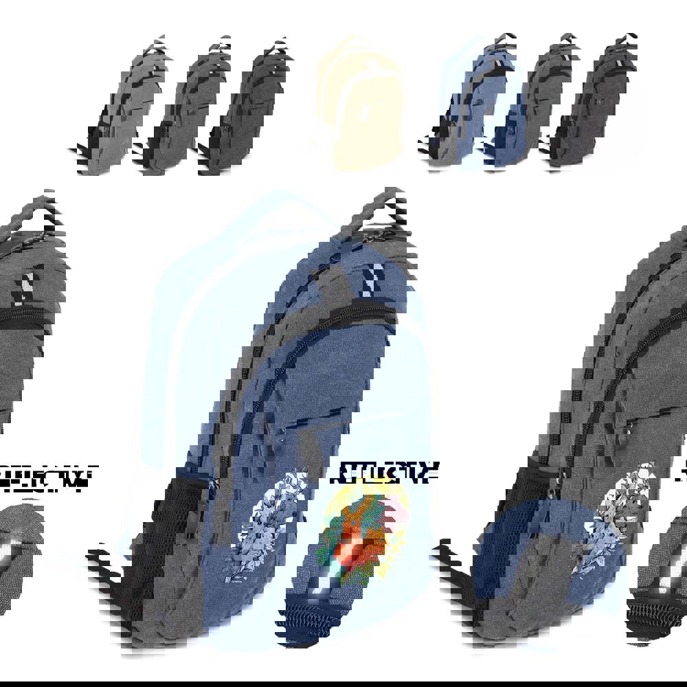 Stilvoller Rucksack aus recyceltem Baumwoll-Canvas. Mit 100 % recyceltem, reflektierendem Gurtband, luxuriösen Reißverschlüssen und Griffen sowie einem Futter aus 100 % recyceltem Polyester. Mit gepolstertem Rücken, Haltegriff, verstellbaren Schultergurten, 2 Seitentaschen für Flaschen oder einen Regenschirm, Fronttasche und Laptop-Innenfach.