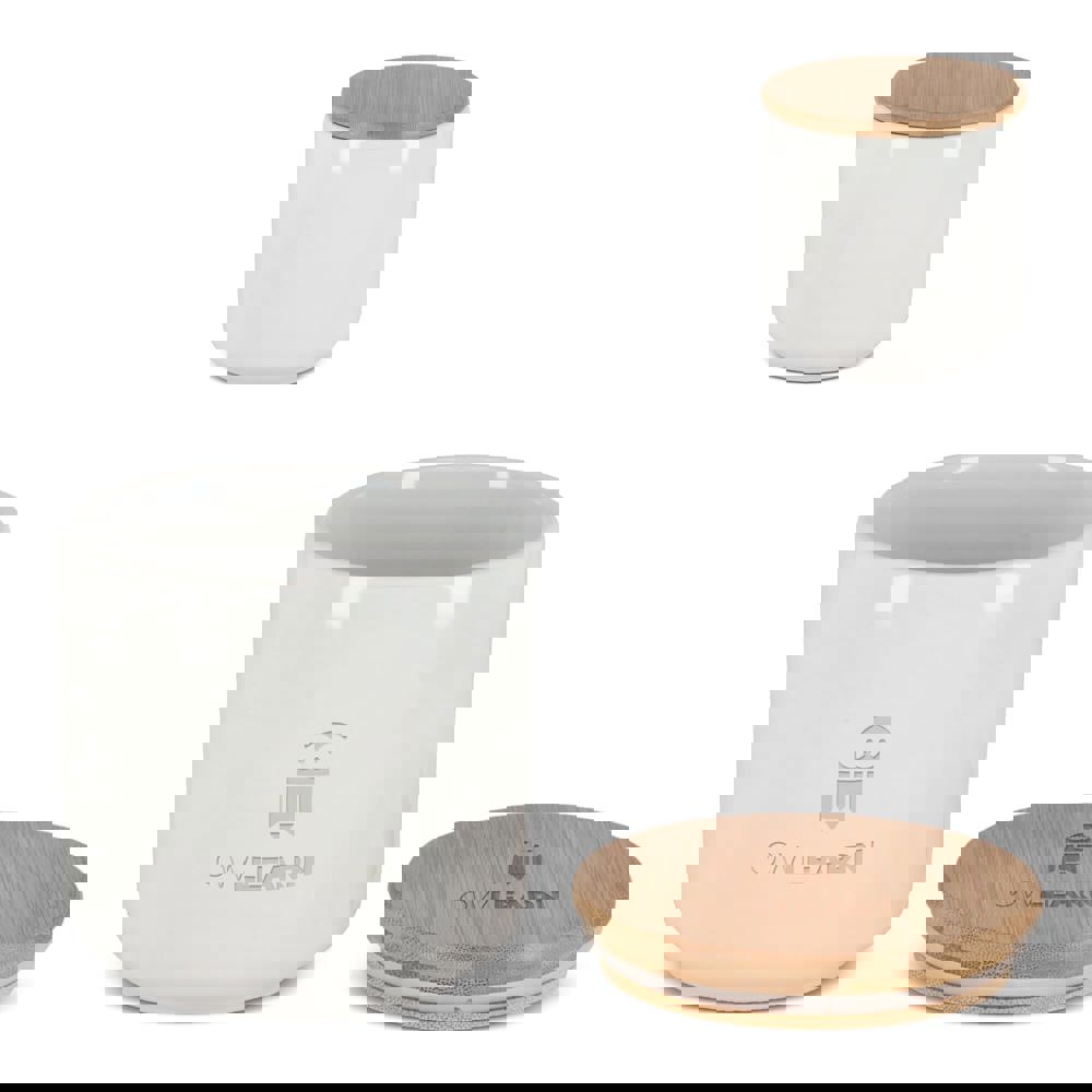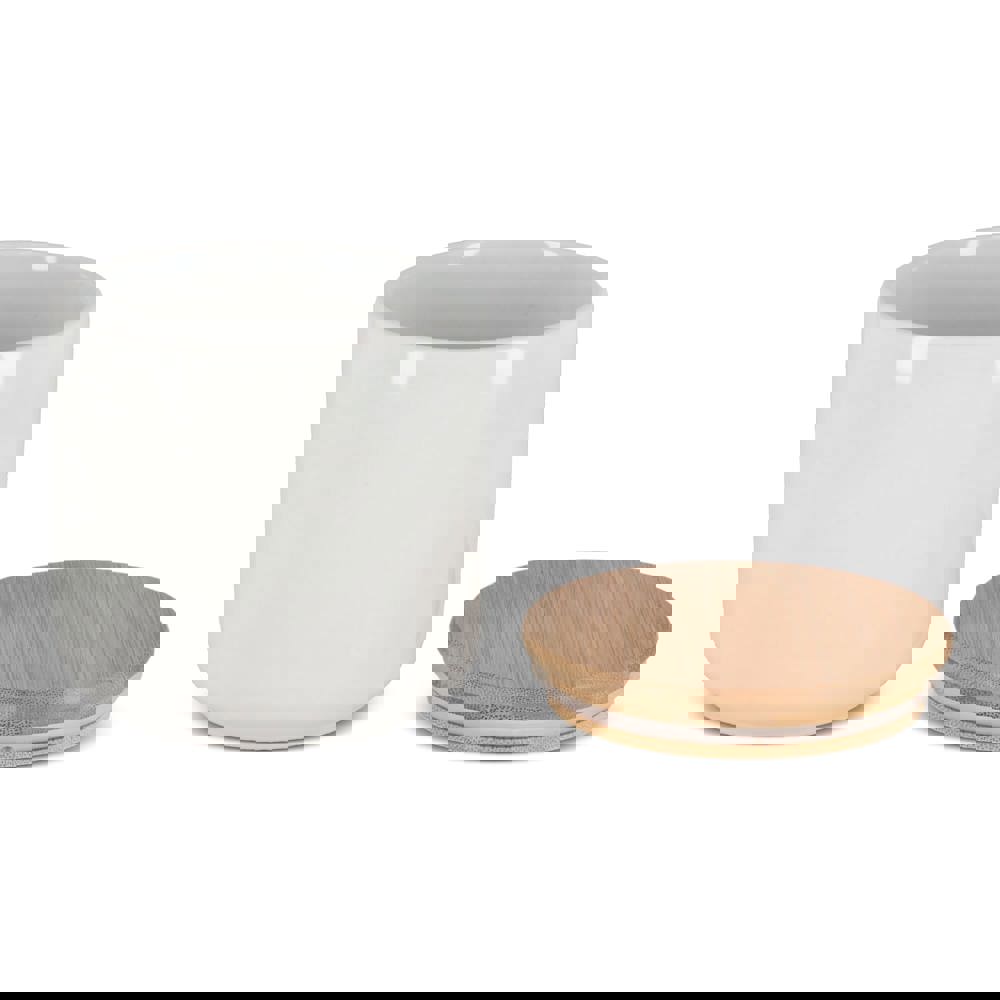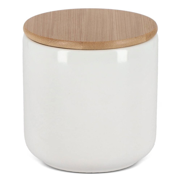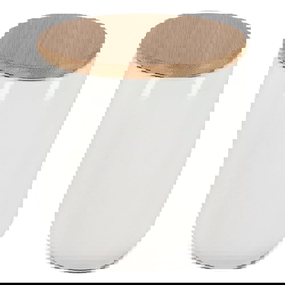 Bewahren Sie Ihre Kleinigkeiten oder Trockenwaren stilvoll in unserem 500-ml-Keramik- und Bambusbehälter auf. Eine moderne Kombination aus der Haltbarkeit von Keramik und Bambusakzenten für elegante Aufbewahrung.