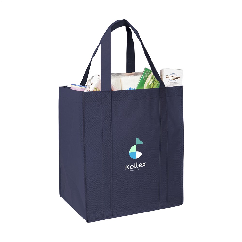 Praktische, extra großzügige Einkaufstasche aus recyceltem nonwoven Polyester (80 g/m²). Stark und superleicht. Mit verstärktem Boden, Trageschlaufen und zusätzlicher Aufhängeschlaufe auf der Innenseite. GRS-zertifiziert. Recyceltes Material insgesamt: 94%. Fassungsvermögen ca. 31 Liter.
