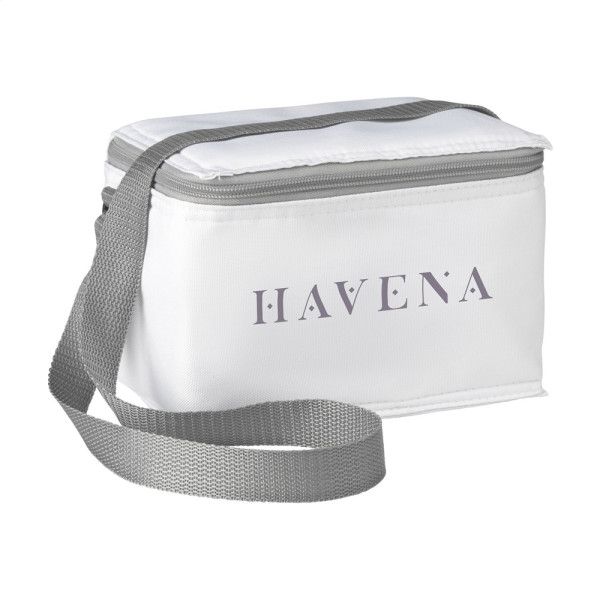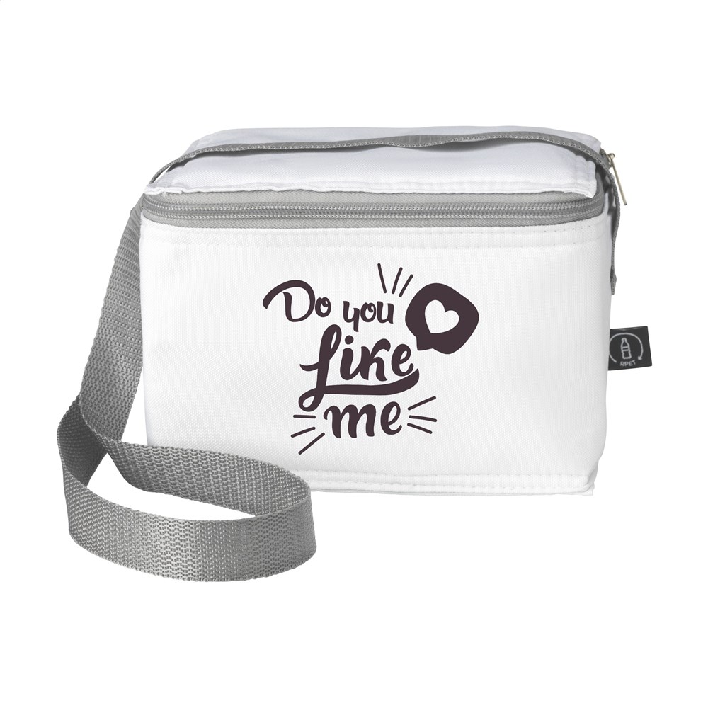 Kühltasche aus 600D-RPET-Polyester-Kühltasche. Geeignet für 6 Getränkedosen. Mit Trageriemen. GRS-zertifiziert. Recyceltes Material insgesamt: 51%. Fassungsvermögen ca. 3 Liter.