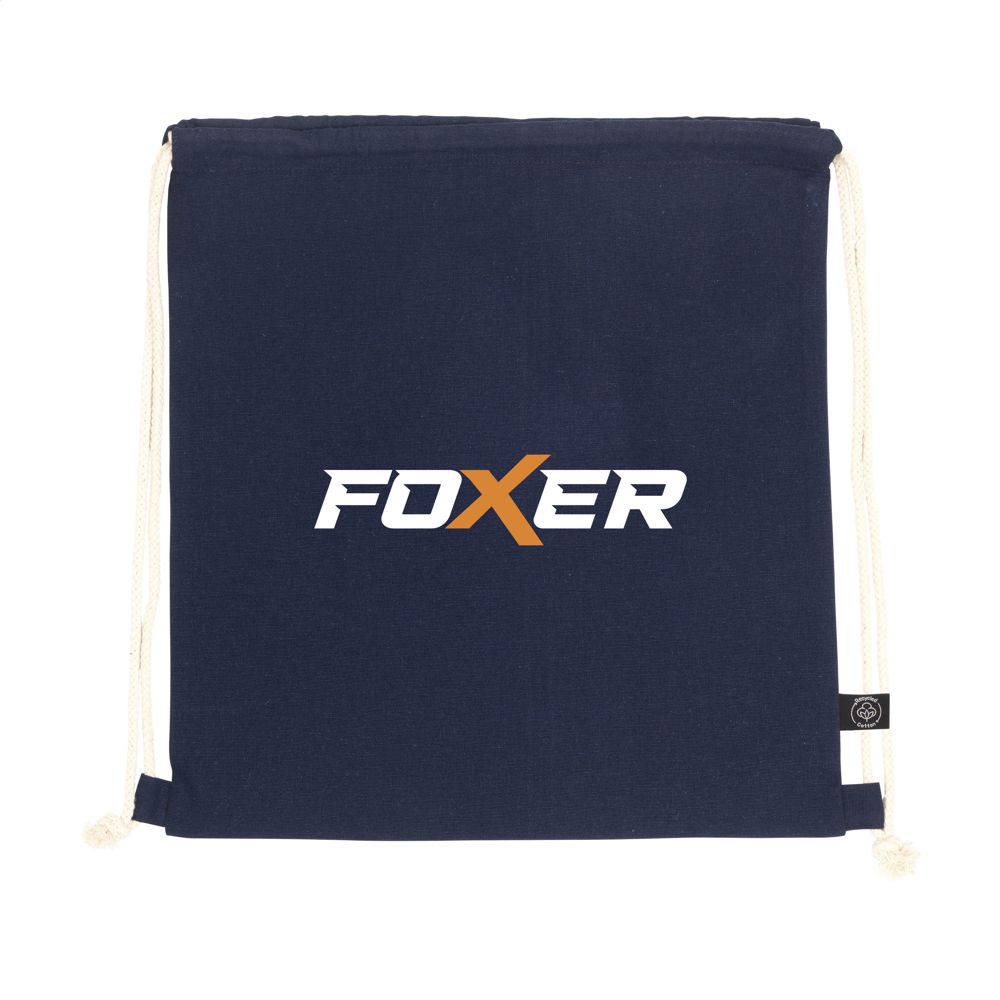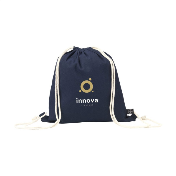 Rucksack mit Kordelzug aus 80% recycelter Baumwolle und 20% recyceltem Polyester (150 g/m²). GRS-zertifiziert. Recyceltes Material insgesamt: 100%. Fassungsvermögen ca. 7 Liter.