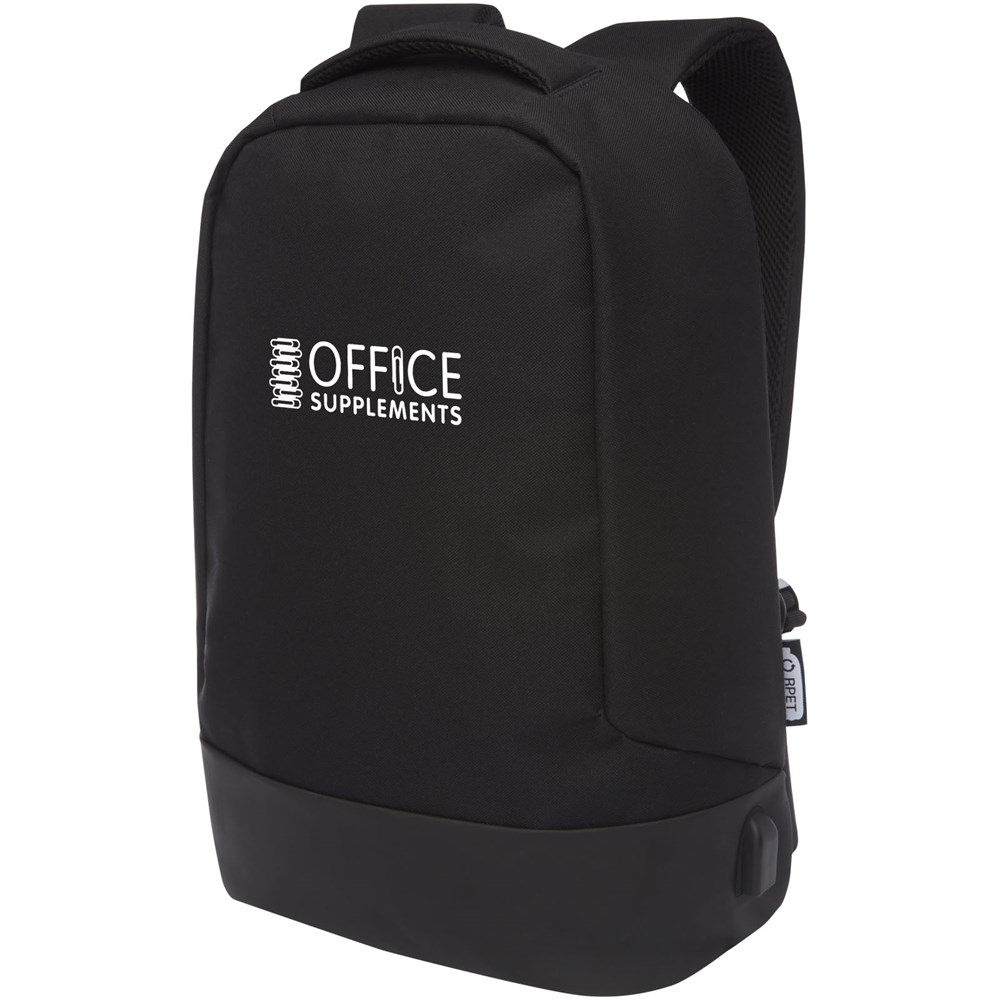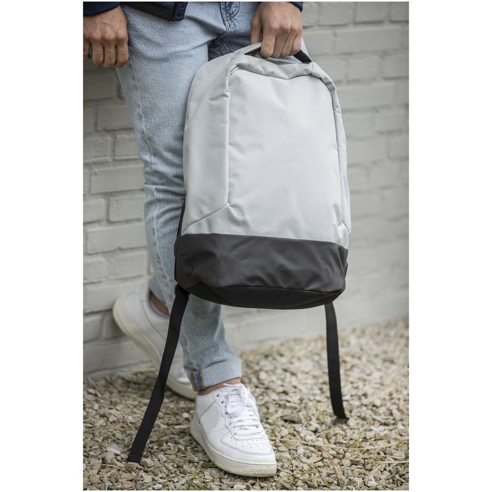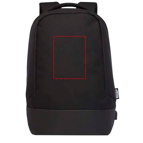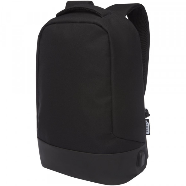 GRS zertifizierter Rucksack, ausgestattet mit einem offenen Hauptfach mit Ordnungsfach, gepolsterter 15" Laptophülle und 2 Taschen mit RFID-Schutz. USB-Port auf der rechten Seite zum einfachen Anschließen und Laden von Geräten aus dem Innenraum. Mit gepolsterten Schultergurten, rechtem Schultergurt, versteckter Reißverschlusstasche, Haltegriff und Trolley-Durchgriff. Für die Herstellung dieser Tasche werden ca. 15 Kunststoffflaschen recycelt.