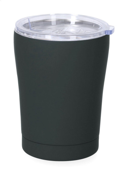 Doppelwandiger Isolier-Thermobecher aus Edelstahl mit gummierter Oberfläche und Trinkdeckel. Füllmenge: 350 ml.