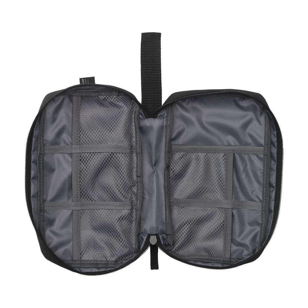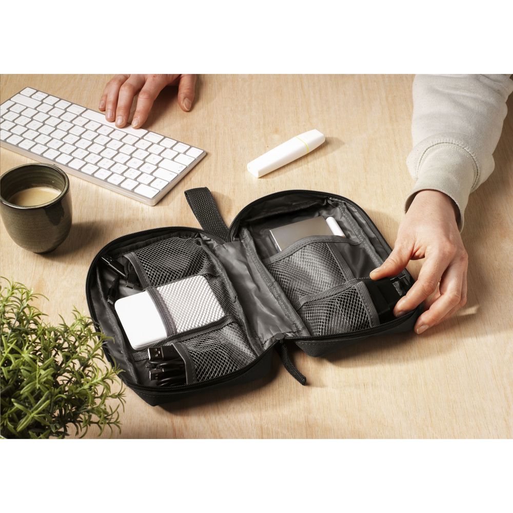 Etui zur geordneten und übersichtlichen Aufbewahrung von Kabeln, Ladegeräten und technischem Zubehör. Hergestellt aus 600D RPET-Polyester. Das Innere bietet reichlich Stauraum, unterteilt in mehrere (Netz-)Fächer. Mit Reißverschluss, einer zusätzlichen Reißverschlusstasche an der Außenseite und einer praktischen Trageschlaufe. Ideal für Reisen, aber auch praktisch für zu Hause oder im Büro. GRS-zertifiziert. Gesamtes recyceltes Material: 88%.