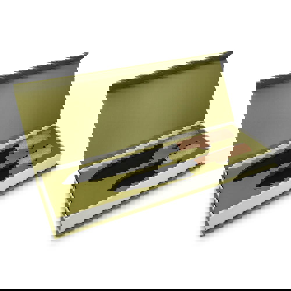 Das InSideOut Santoku-Messer-Set vereint Funktionalität und Stil und ist damit eine hervorragende Ergänzung für jede Küche. Die auf Präzision ausgelegten Santoku-Messer eignen sich perfekt zum hauchdünnen Schneiden und feinen Hacken von Obst und Gemüse. Die hohen Klingen bieten eine ausgezeichnete Kontrolle, während die Rillen auf der Klinge die Reibung verringern und so das Schneiden selbst großer Produkte erleichtern. Das Besondere an diesem Set sind die markanten schwarzen Klingen in Kombination mit den eleganten Griffen aus FSC-zertifiziertem Buchenholz, die für einen modernen, raffinierten Look sorgen. Das Set besteht aus zwei Messern, einem 30-cm- und einem 24-cm-Messer, die elegant in einer luxuriösen Geschenkbox verpackt sind - perfekt zum Verschenken oder für den persönlichen Gebrauch.die Verwendung in der Spülmaschine wird nicht empfohlen.