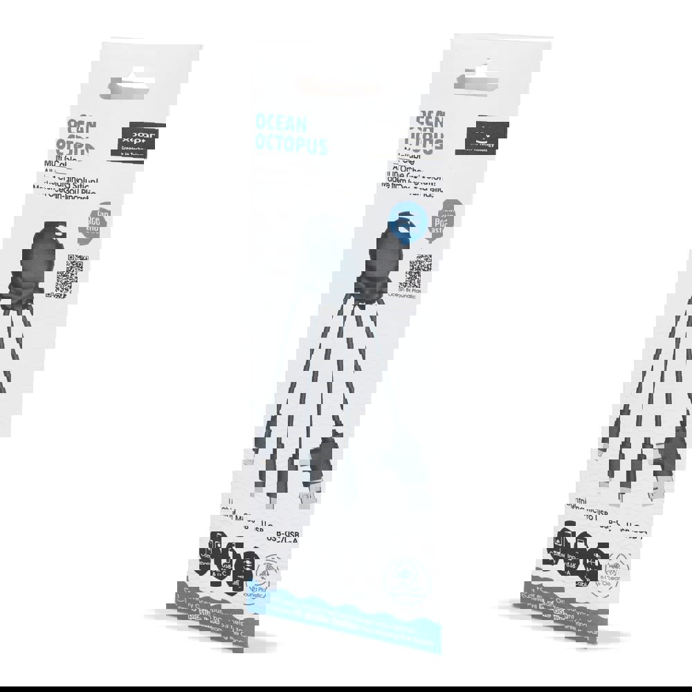 Das Eco Octopus Ladekabel ist aus ozeangebundenem Kunststoff hergestellt. Mit zwei (USB-A & USB-C) Eingängen und drei verschiedenen Anschlüssen können Sie Ihre Geräte umweltfreundlich aufladen. Am Schreibtisch, im Auto, in der Tasche oder im Urlaub; dieses Multiladekabel ist immer praktisch!
