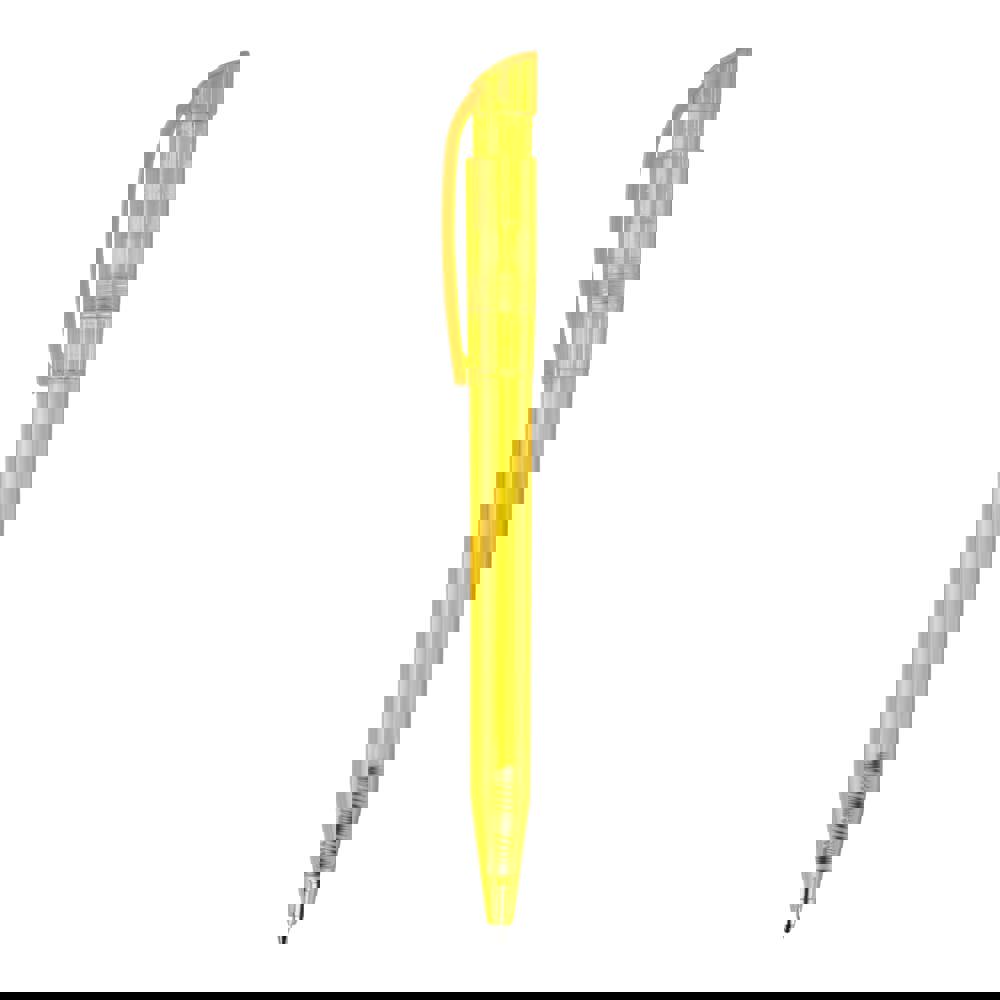 Moderner transparenter Kugelschreiber mit gebogenem Clip. Ein beliebter Werbeartikel wegen seiner großen Druckfläche. Druckkugelschreiber ausgestattet mit einer blau schreibenden X20-Refill-Mine. Druckkugelschreiber aus ABS, hergestellt in Europa. Ab einer Abnahmemenge von 5.000 Stück sind eigene Farbkombinationen möglich.