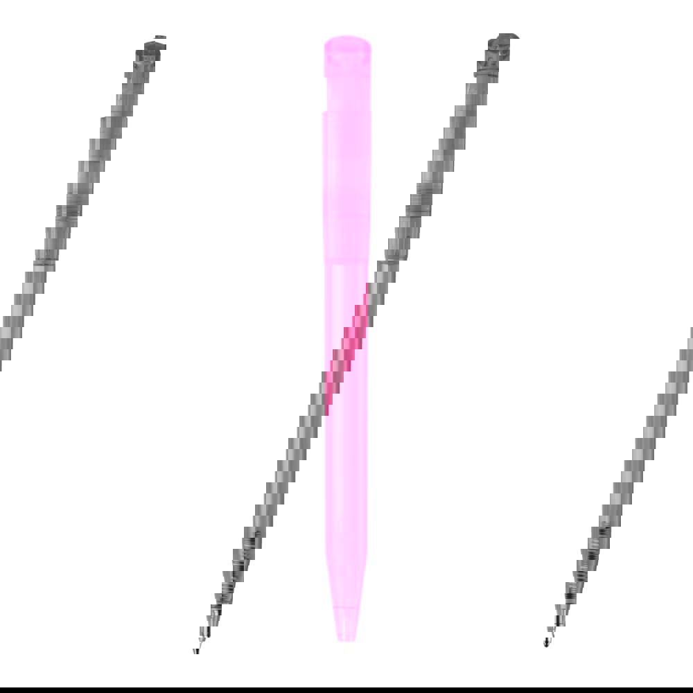 Moderner transparenter Kugelschreiber mit gebogenem Clip. Ein beliebter Werbeartikel wegen seiner großen Druckfläche. Druckkugelschreiber ausgestattet mit einer blau schreibenden X20-Refill-Mine. Druckkugelschreiber aus ABS, hergestellt in Europa. Ab einer Abnahmemenge von 5.000 Stück sind eigene Farbkombinationen möglich.