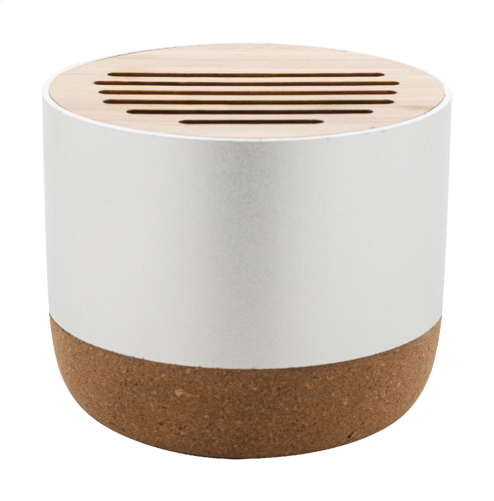 Kabelloser Lautsprecher, Gehäuse aus recyceltem Aluminium mit Bambusgitter und Sockel aus Naturkork. Mit wiederaufladbarem Akku (400 mAh). Inklusive USB-Ladekabel.