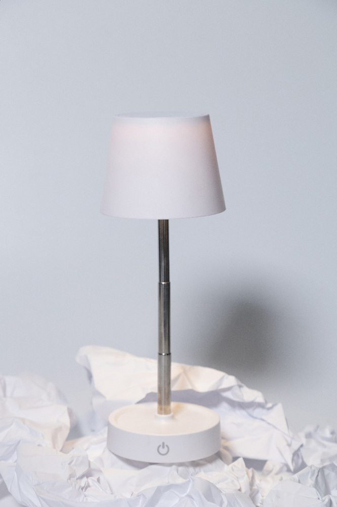 Teleskopische Tischleuchte aus recyceltem ABS mit 12 LEDs, einstellbarer Helligkeit und 1200 mAh USB-Akku. Inklusive USB-Ladekabel.