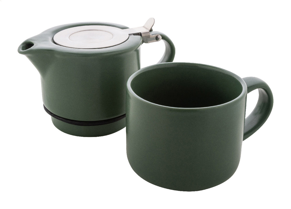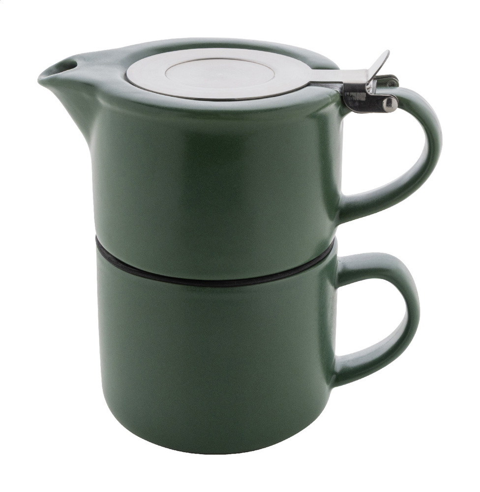 Hochwertiges Teeservice aus Keramik mit matter Oberfläche. Enthält eine Teekanne (430 ml) mit Edelstahldeckel und Teesieb, die sich perfekt auf die passende Tasse (400 ml) stapeln lässt. Einzeln in einer Kraftpapierbox.