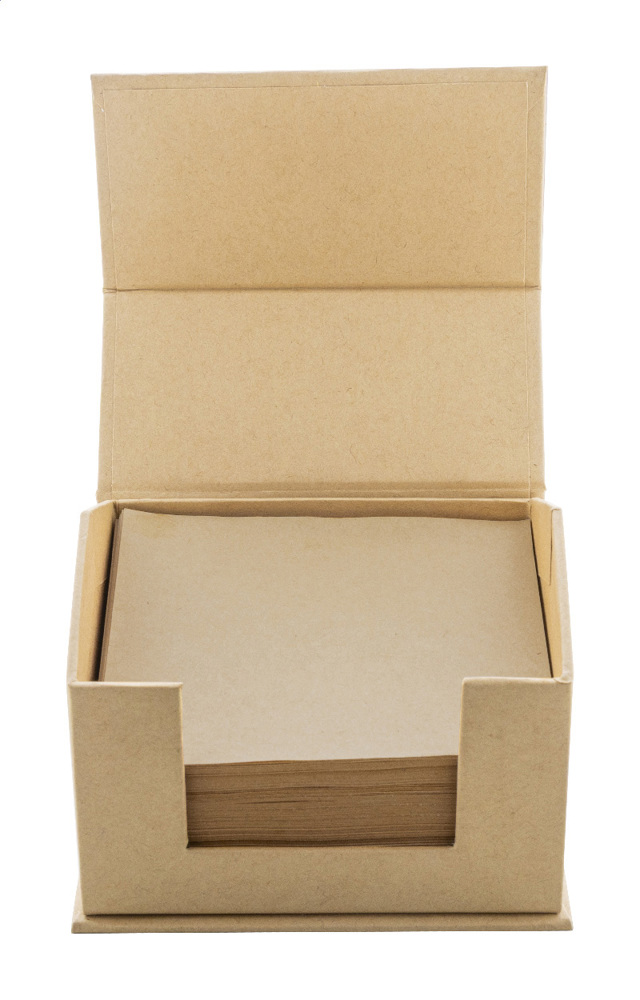 Hausförmiger Notizspender aus recycelter Pappe mit 300 Blatt Memo-Block aus recyceltem Kraftpapier. Oben mit 25 gelben Haftnotizen und 100 Seitenmarkierungen in 4 Farben.