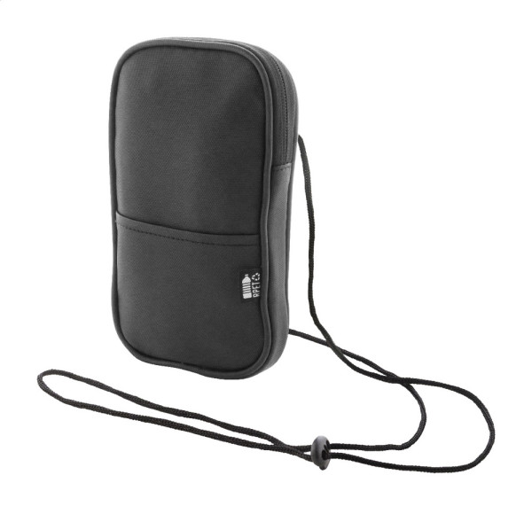Wasserfeste RPET-Crossbody-Handytasche mit Reißverschluss-Hauptfach, Fronttasche und verstellbarem Tragegurt. Material: PU-beschichtetes 600D RPET-Polyester. Mit RPET-Label.