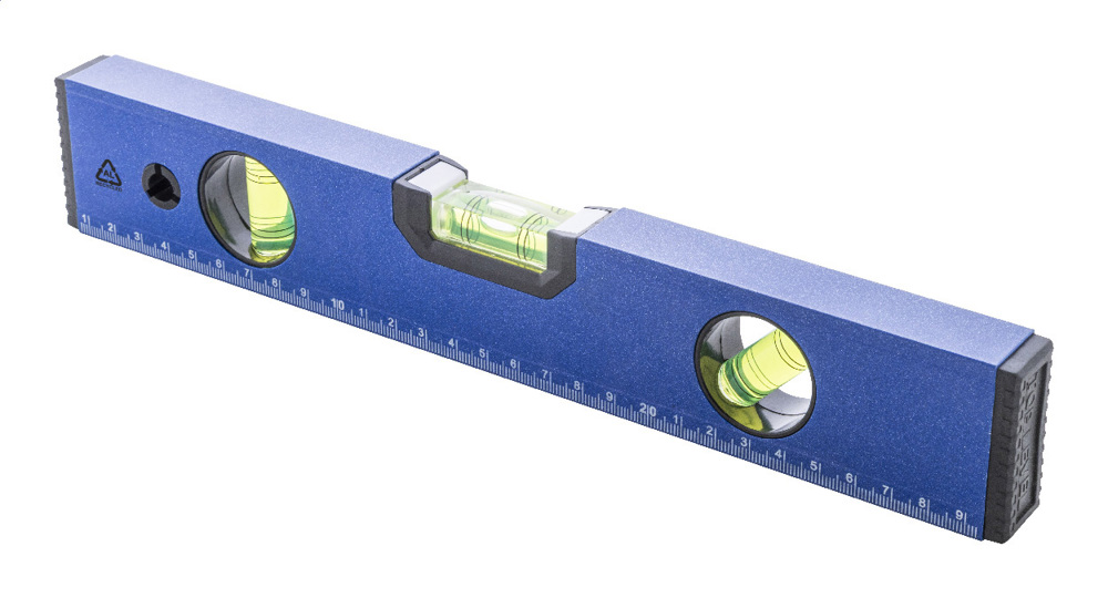 Magnetische Wasserwaage aus recyceltem Aluminium mit dreifacher Libelle (horizontal, vertikal und 45°) und 30 cm Lineal.