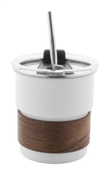Einwandiger Reisebecher aus recyceltem Edelstahl mit Griff aus Walnussholz, Trinkdeckel aus Kunststoff und Strohhalm aus recyceltem Edelstahl. Füllmenge: 260 ml.