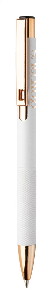 Kugelschreiber aus recyceltem Aluminium mit mattiertem Gehäuse, strukturiertem Griffstück und Roségold-Details, blauschreibend. Mit Spezialbeschichtung für Spiegelgravur in Roségold.