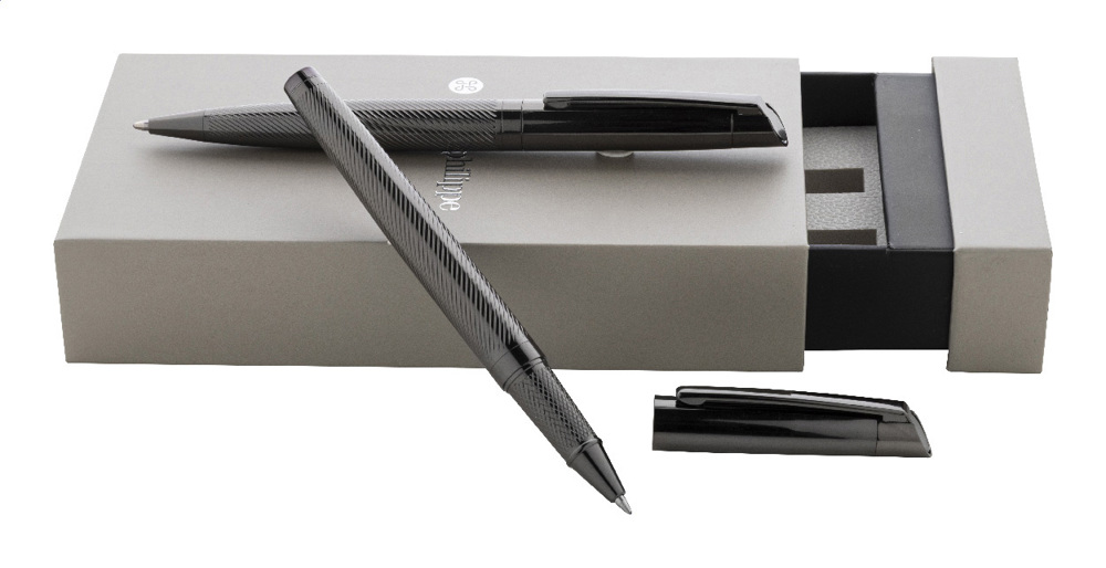Elegantes Kugelschreiber- und Tintenroller-Set aus Metall mit diagonal strukturiertem Schaft, blauschreibend. In zweifarbiger Geschenkbox. Marke: André Philippe.