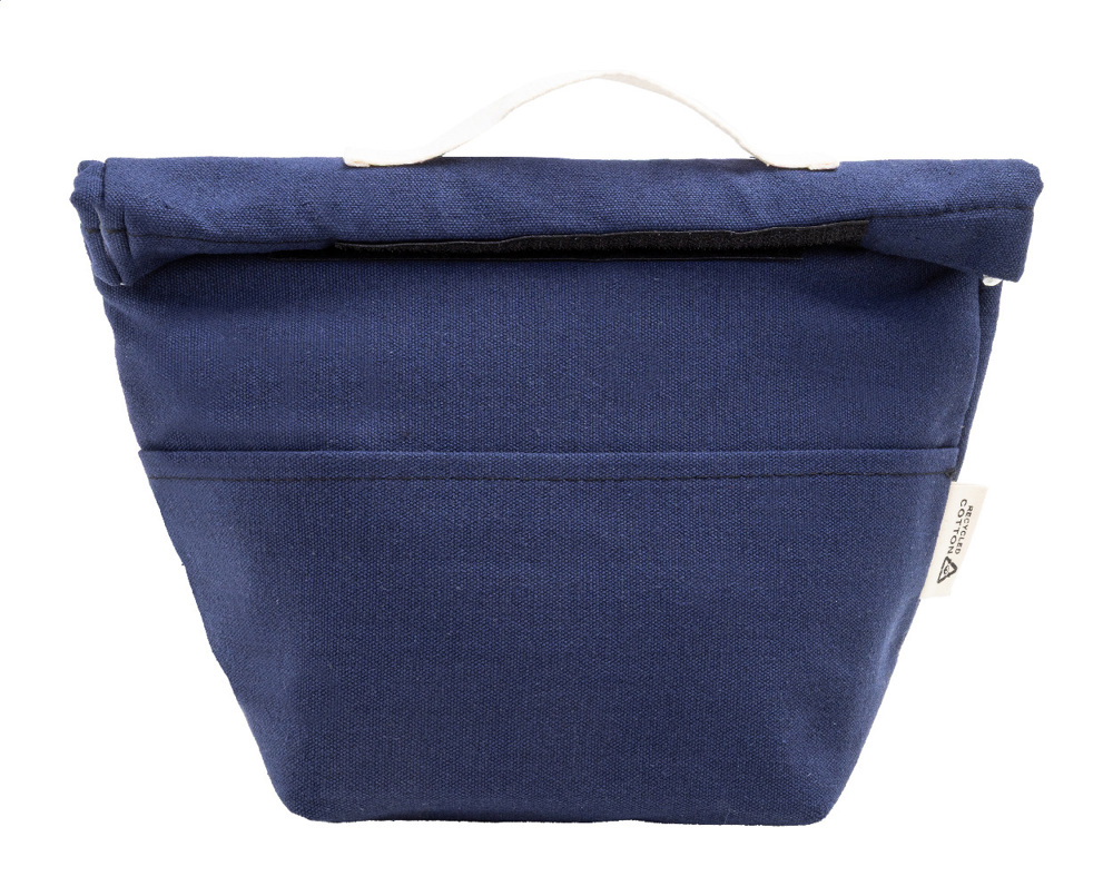 Rolltop-Kühltasche aus recyceltem Canvas mit Fronttasche, Aluminiumpolsterung und Klettverschluss. Material: 70 % recycelte Baumwolle und 30 % RPET-Polyester. Mit Label recycelte Baumwolle.