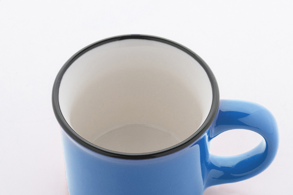 Mini-Vintage-Keramikbecher mit schwarzem Rand, innen weiß und außen farbig. Füllmenge: 90 ml. Einzeln in Kraftpapierbox.