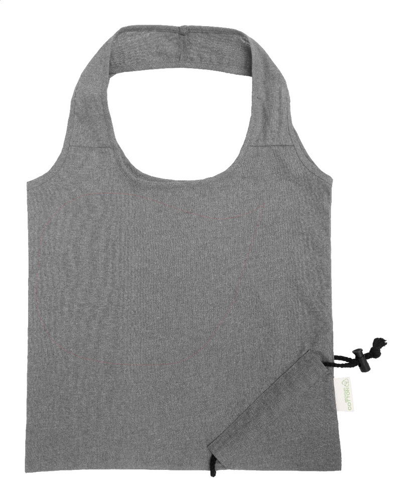 Faltbare Einkaufstasche aus 70 % recycelter Baumwolle und 30 % RPET-Polyester, 140 g/m². Mit Label recycelte Baumwolle.