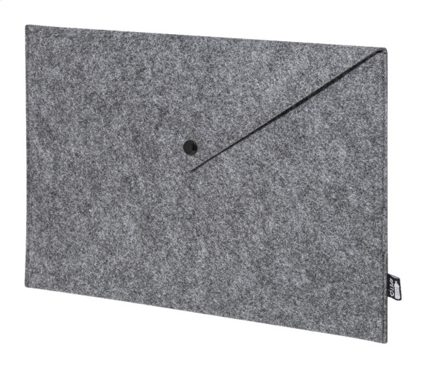 Dokumenten- oder Laptoptasche aus RPET-Filz mit Druckknopfverschluss. Passend für Laptops bis 13 Zoll. Mit RPET-Label.