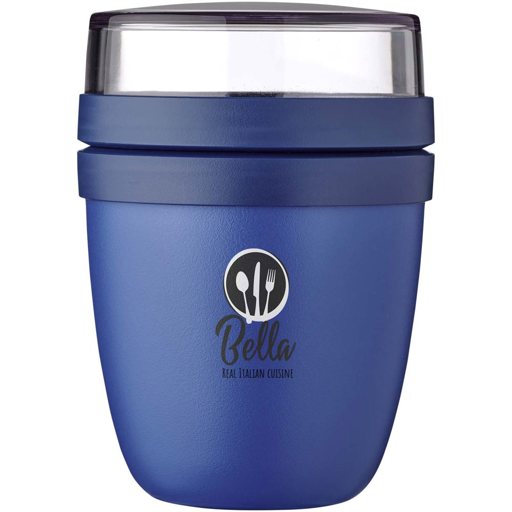Der Ellipse Mini Lunchpot ist ideal für Snacks wie Joghurt mit Müsli oder Suppe mit Croutons. Zwei praktische Fächer in einem robusten Behälter halten die Zutaten sauber getrennt. Dank kompakter Größe passt er bequem in jede Schultasche – für eine schnelle, unkomplizierte Mahlzeit unterwegs. Der obere transparente Behälter fasst 120 ml – ideal für etwa 50 g Müsli oder Obst –, der untere Behälter hat ein Fassungsvermögen von 300 ml. Auslaufsicher und spülmaschinengeeignet. BPA frei.