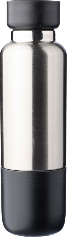 Doppelwandige Edelstahl-Trinkflasche (500 ml) mit einer Innenseite aus Edelstahl 304 und einer Außenseite aus Edelstahl 201. Ausgestattet mit einem PP-Schraubdeckel mit transparentem AS-Fach, austauschbaren Handgelenk- und Trageriemen aus Polyester und einem 200 ml PP-Trinkbecher im Boden. Silberner Korpus mit matten Farben im Detail. Einzeln verpackt in einer weißen Pappschachtel.