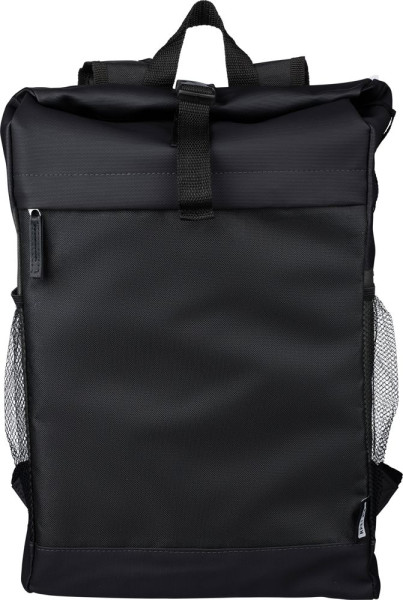 Dieser Rolltop-Rucksack ist aus rPET (600D) Polyester mit PU-Beschichtung zur Wasserabweisung gefertigt. Er verfügt über eine versteckte Reißverschlusstasche auf der Vorderseite, ein gepolstertes Laptop-Fach für Geräte bis 15 Zoll, seitliche Netztaschen sowie insgesamt fünf Fächer, darunter Innen- und Vordertaschen. Er verfügt über verstellbare Tragegurte und einen selbstklebenden Rolltop-Verschluss. Er bietet ein Fassungsvermögen von 25 Litern und eine Tragfähigkeit von 15 kg. Er verfügt über ein rPET-Etikett an der Seite und ein individuelles Etikett auf der Innenseite.