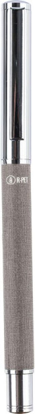 Dieser Rollerball-Stift ist aus Messing und rPET gefertigt und verfügt über einen Metallclip sowie ein Griffstück. Er verfügt über einen Schiebemechanismus und ein rPET-Logo auf dem Gehäuse. Er ist einzeln verpackt in einer braunen Pappschachtel. Blaue Tinte.
