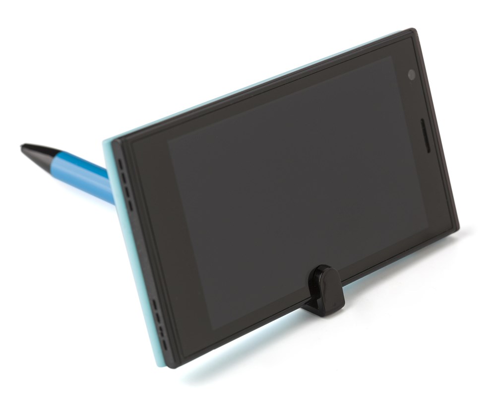 Kugelschreiber aus Aluminium, mit Druckfunktion, schwarzen Akzenten, Smartphone-Halter und blauer Mine.