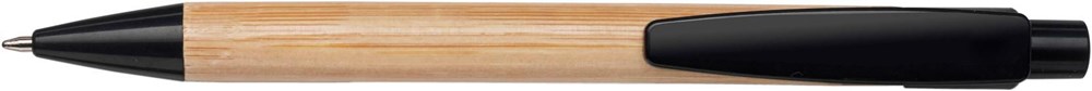 Kugelschreiber aus Bambus, mit Applikationen aus Kunststoff und blauer Mine.
