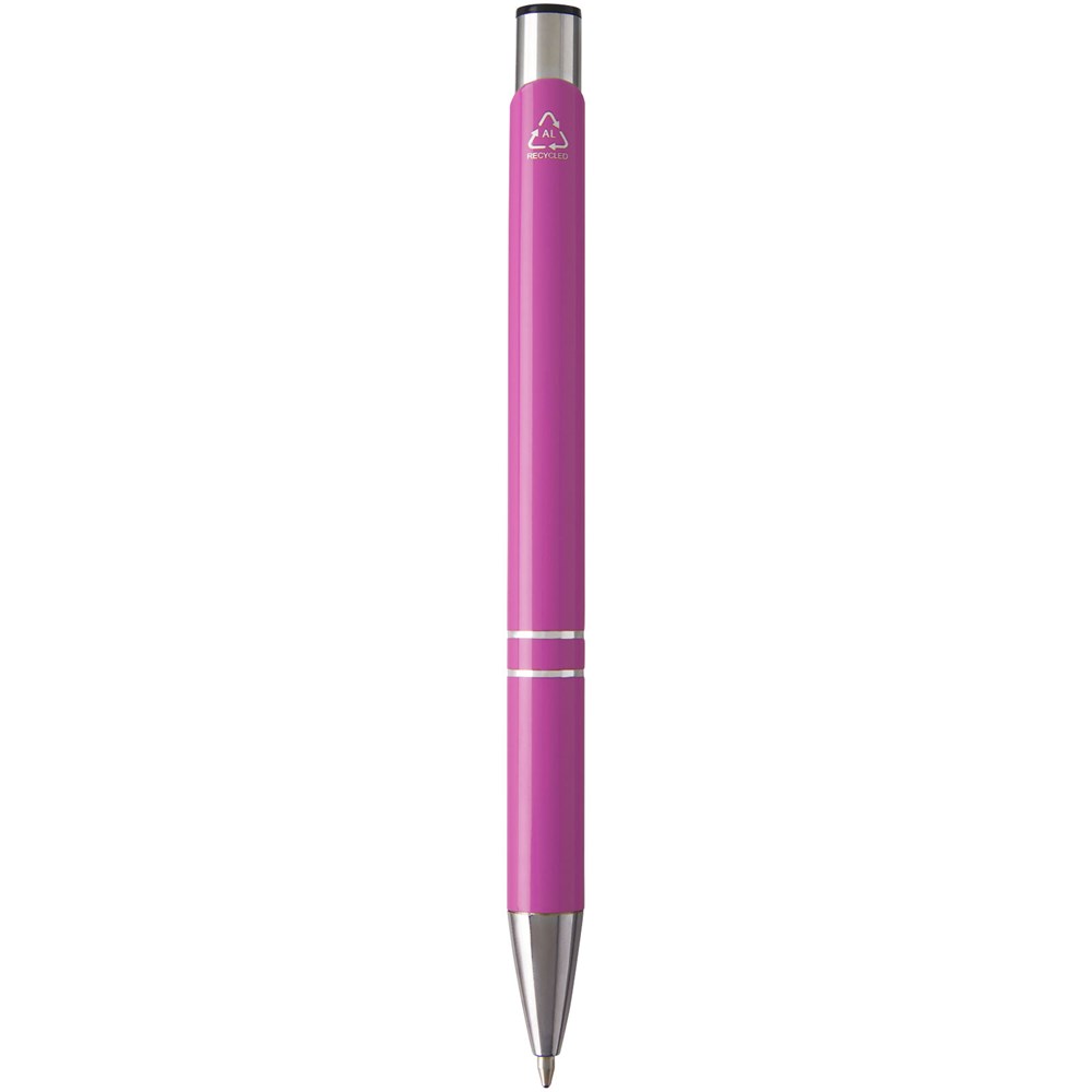 Kugelschreiber aus recyceltem Aluminium in lackierter Ausführung, poliert, glänzend, mit markanten Chromdetails. Recyceltes Aluminium ist eine nachhaltigere Option, da weniger Energie benötigt wird als bei der Herstellung von Aluminium aus Primärrohstoffen. Es reduziert außerdem die Abfallmenge auf Mülldeponien und trägt dazu bei, natürliche Ressourcen zu schonen und Treibhausgasemissionen zu reduzieren. Schwarze Tinte. Schreiblänge: 600 Meter.