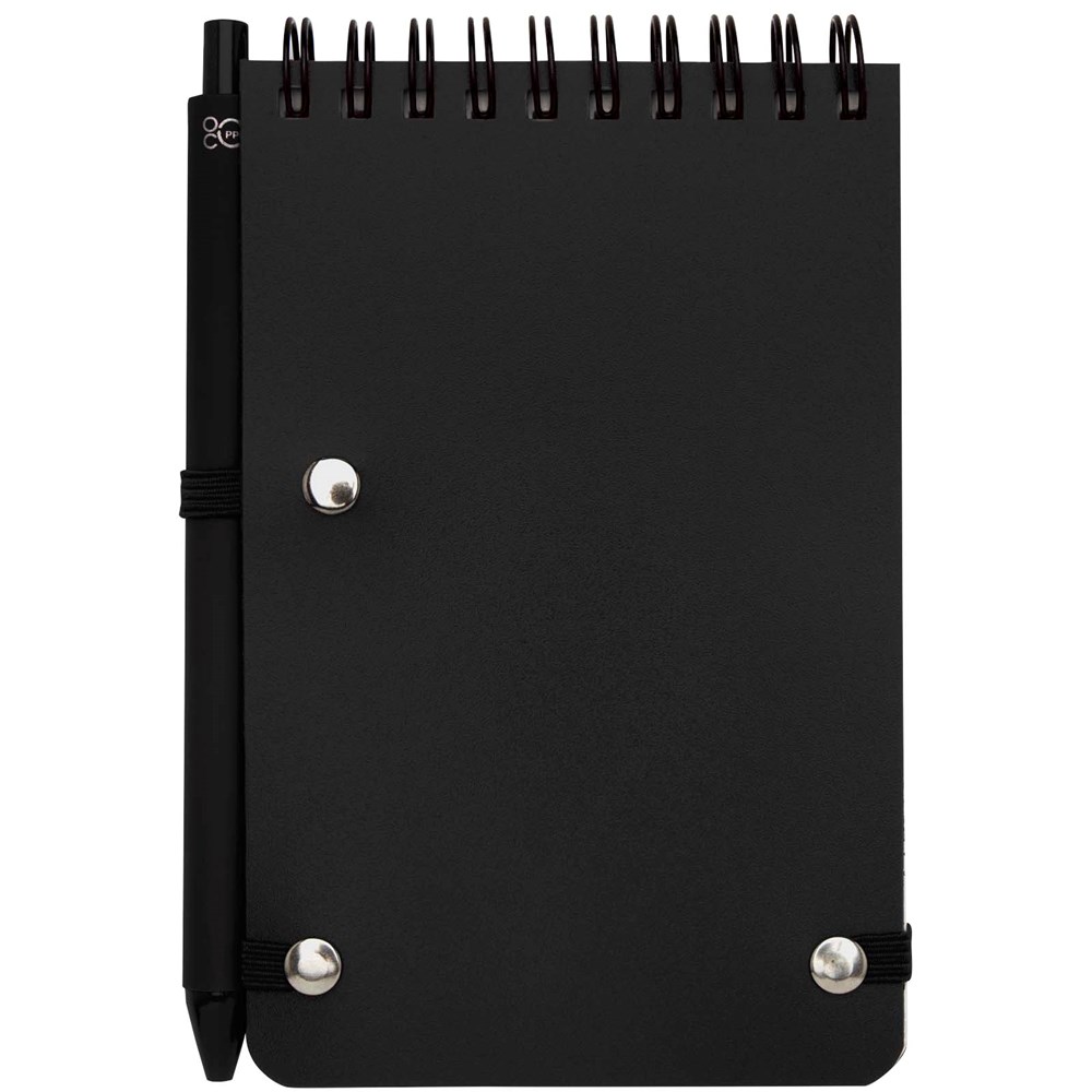 Das Thalaasa A6 Hardcover Notizbuch besteht aus recyceltem ozeangebundenem Kunststoff und umfasst 80 Blatt, liniert, aus cremefarbenem 70 g/m² Papier. Das Notizbuch hat abgerundete Ecken. Es ist mit einem elastischen Verschluss und einer Stiftschlaufe ausgestattet. Der Kugelschreiber mit schwarzer Tinte ist ebenfalls aus recyceltem, ozeangebundenem Kunststoff hergestellt. Schreiblänge: 1000 Meter. Spitzengröße: 1,0 mm.