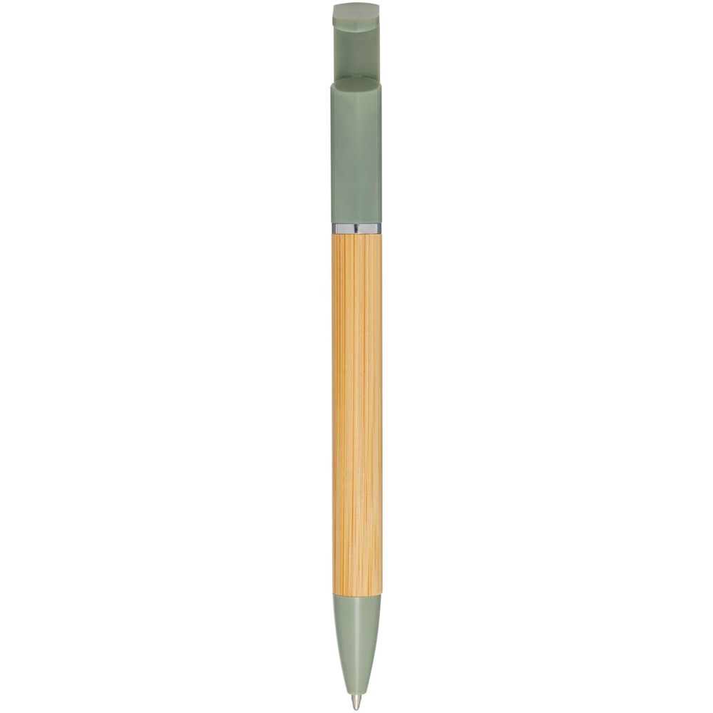 Bamboo-Kugelschreiber, der auch als Telefonhalterung fungiert. Der Knopf und der Mittelring bestehen aus recyceltem Kunststoff, die Spitze aus Messing und der Schaft aus nachhaltig angebautem Bambus. Tintenfarbe: Blau. Schreiblänge: 1000 Meter. Strichstärke: 1,0 mm.