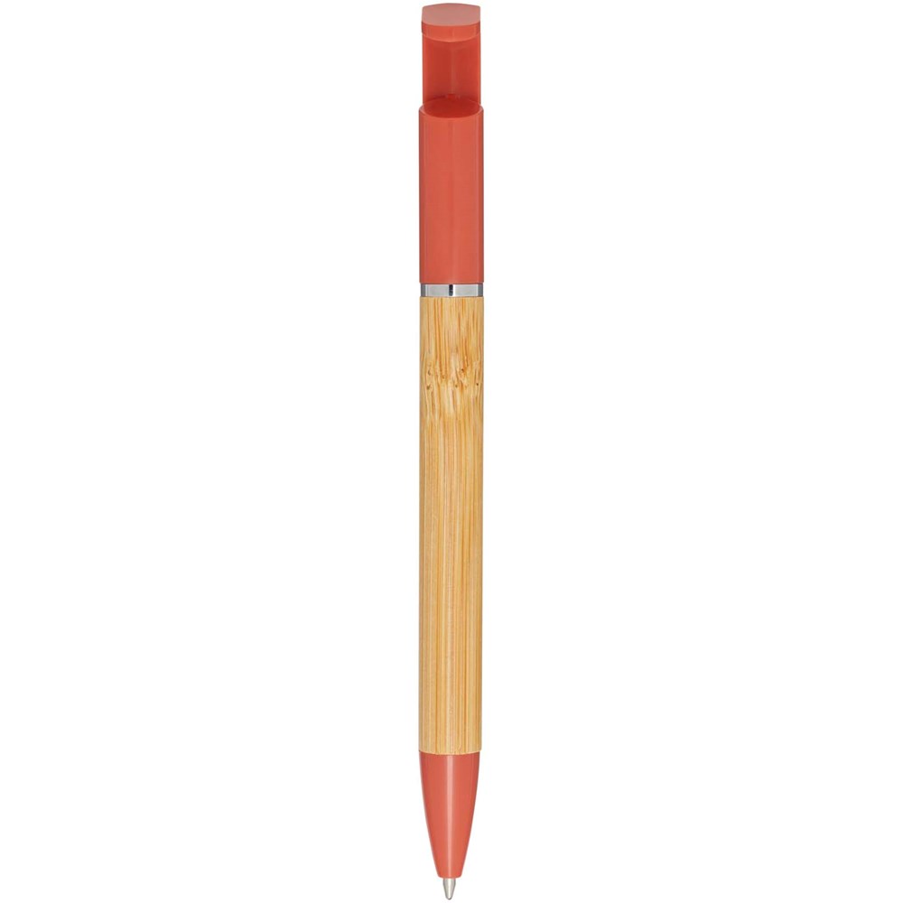 Bamboo-Kugelschreiber, der auch als Telefonhalterung fungiert. Der Knopf und der Mittelring bestehen aus recyceltem Kunststoff, die Spitze aus Messing und der Schaft aus nachhaltig angebautem Bambus. Tintenfarbe: Schwarz. Schreiblänge: 1000 Meter. Strichstärke: 1,0 mm.